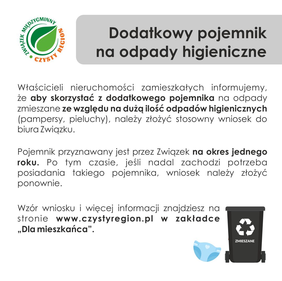 W przypadkach uzasadnionych używaniem na nieruchomości artykułów higienicznych w postaci pieluch lub pieluchomajtek i wynikającego stąd przekroczenia pojemności pojemników na odpady zmieszane, na wniosek właściciela nieruchomości Związek wyposaży nieruchomość w dodatkowy pojemnik na niesegregowane (zmieszane) odpady komunalne na okres jednego roku.